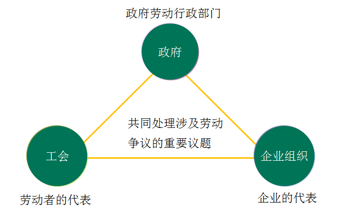 根据国际劳工组织1976年144号《三方协商促进国际劳工标准公约》规定,三方机制是指政府(通常以劳动部门为代表)、雇主和工人之间,就制定和实施经济和社会政策而进行的所有交往和活动。