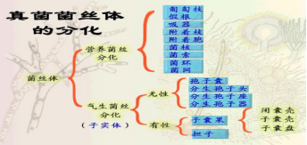 A、营养菌丝体的特化形态:假根、匍匐枝 、吸器、菌网、菌环、菌核、附着胞、附着枝、菌索