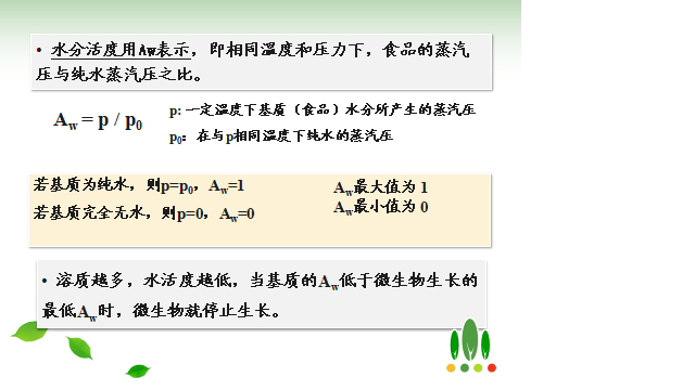 (1)水分活度:食品中的绝对含水量包括游离态水和结合态水,前者可被微生物利用,后者不能利用,故食品中含有的水分不能用绝对含水量(%)表示,而是用水分活度表示食品中可被微生物利用的自由水或游离水的含量。