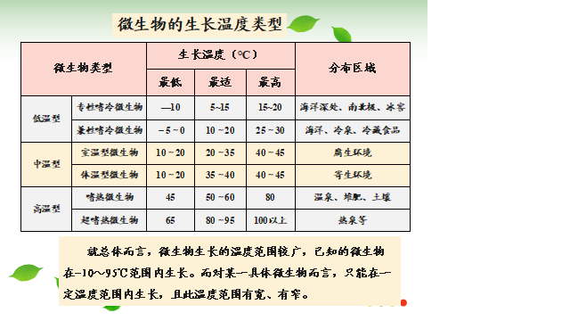 微生物按其最适生长温度范围可分为: 低温型、中温型、高温型