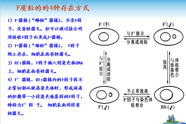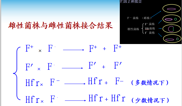 供体菌(“雄性”)通过性菌毛与受体菌(“雌性”)直接接触,把F质粒或其携带的不同长度的核基因组片断传递给后者,使后者获得若干新遗传性状的现象,称为接合。