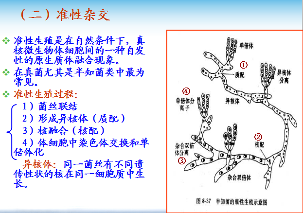 准性杂交:同种生物的两个不同的体细胞发生融合,以有丝分裂的方式而导致低频率的基因重组并产生重组子的杂交方式。