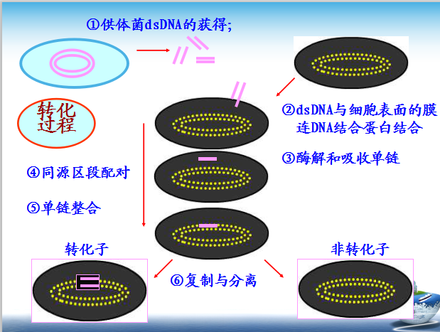 1、定义:受体菌直接吸收来自供体菌的DNA片断,通过交换将其整合到自己的基因组中,从而获得了供体菌部分遗传性状的现象,称为转化。
