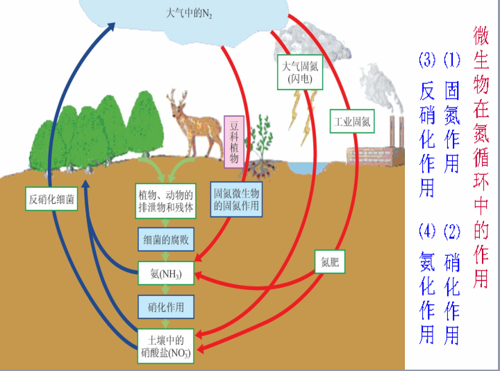 由硝化菌产生的硝酸盐在无氧条件下被一些微生物还原成为氮气,重新回到大气中,开始新的氮素循环。 微生物在氮素循环中的几种作用归纳为:固氮作用、硝化作用、同化作用、氨化作用和反硝化作用。