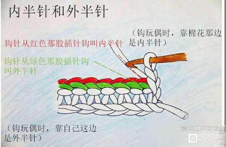 挑半针因为挑针位置明显,最容易,所以适合初学者,不足的是这样勾出来的针目会有些缝隙。