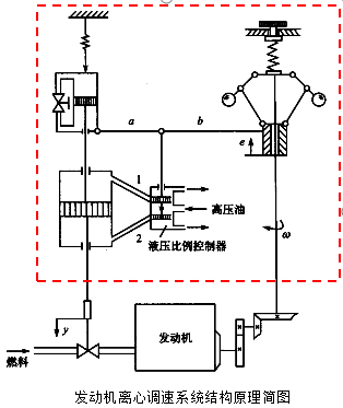 发动机离心调速系统的目的是,无论作用在发动机上的负载怎么变化,其输出转速要基本保持为恒定。其工作原理为:如果负载变化使ω增大,离心结构的滑套就会上移,通过ab杆带动液压比例控制器的滑阀阀芯上移,高压油通过1油路进入油缸上侧油箱,进而推动动力活塞下移,致使油门关小,输出转速ω减小,直到液压滑阀回复到中位,ω回到设定值,自动调节结束。反之亦然。