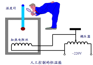 上图所示为人工控制的恒温箱。当箱中的温度受环境温度或电源电压波动等外来的干扰而变化时,为满足箱中温度的恒定要求,可由人工来移动调压器的活动触头,以改变加热电阻丝的电流,从而控制箱内的温度。箱内温度由温度计来检测。这里,恒温箱为被控对象,箱内温度为被控量(参数),温度计为检测元件,调压器为控制器。人工控制恒温箱温度的过程如下: