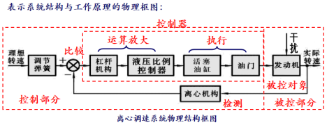 上图所示为发动机离心调速系统结构原理简图。燃料燃烧形成的燃气作为动力源作用在发动机上,通过发动机内部信息的传递与加工处理,使得发动机输出轴产生一定速度的转动。如果没有图中虚线框所示的离心调速装置,当发动机负载一定时,输入的燃气量越多,发动机输出轴就转动得越快;反之就越慢。当发动机输出轴所带的负载变化时,如果输入的燃气量恒定,则发动机的输出转速会发生变化,负载越大转速就会越慢。