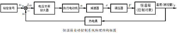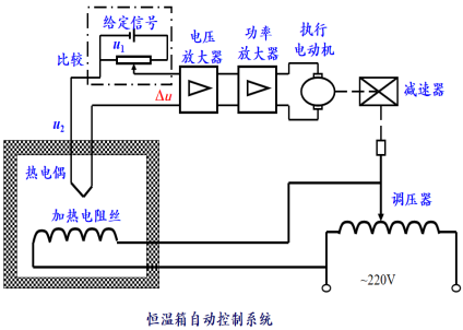 在这个系统中,选取电压u1代表恒温箱的给定信号,当外界因素引起箱内温度变化时,热电偶作为检测元件,把箱内温度转换为对应的电压信号u2,并使u2能反馈回去与给定信号u1相比较,产生了温度的偏差信号Δu=u1-u2,经电压、功率放大后,来控制执行电机的旋转速度与方向,并通过传动机构及减速器带动调压器触头移动,使加热电阻丝的电流增加或减小,直至Δu=0,此时箱内温度达到给定值,电机停转,温度自动调节结束。