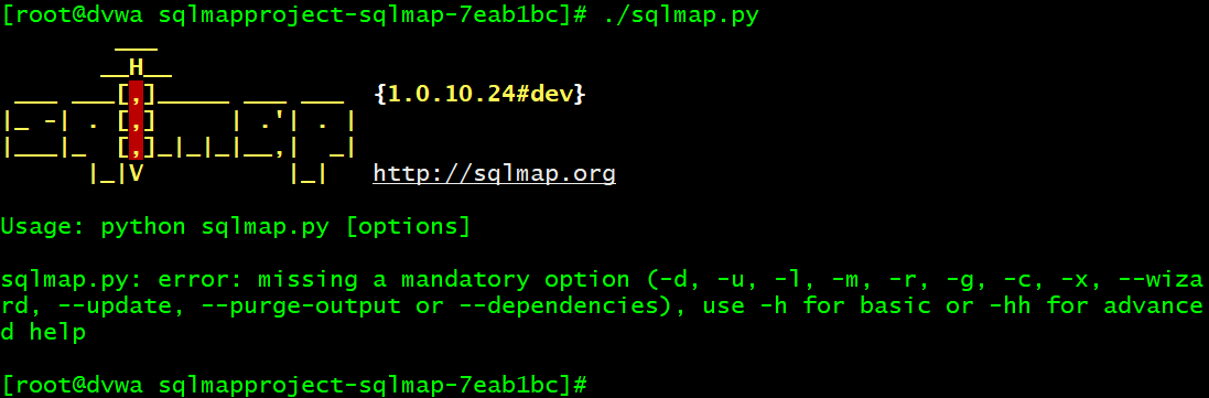 sqlmap.py: error: missing a mandatory option (-d, -u, -l, -m, -r, -g, -c, -x, --wizard, --update, --purge-output or --dependencies), use -h for basic or -hh for advanced help