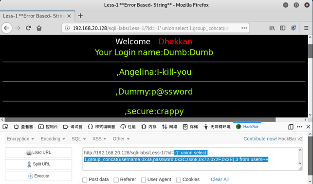通过SQL注入获得sqli-labs系统中数据库security表users的所有用户名和密码。
