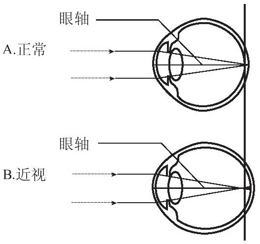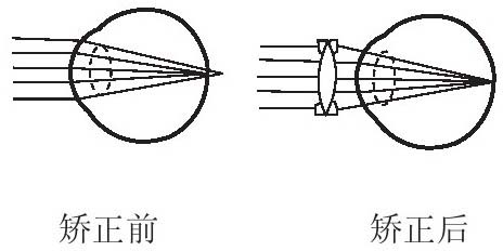 如果眼球的前后径过长,或晶状体的曲度过大,形成的物像会落在视网膜前方,人就因此无法看清远处的物体,见图2-58。单纯的因睫状体疲劳形成的近视是假性近视,是功能性近视,但若得不到及时的纠正,可能会使晶状体变形而发生眼轴改变的轴性近视,即真性近视。近视可以通过佩戴适度的凹透镜片加以纠正。