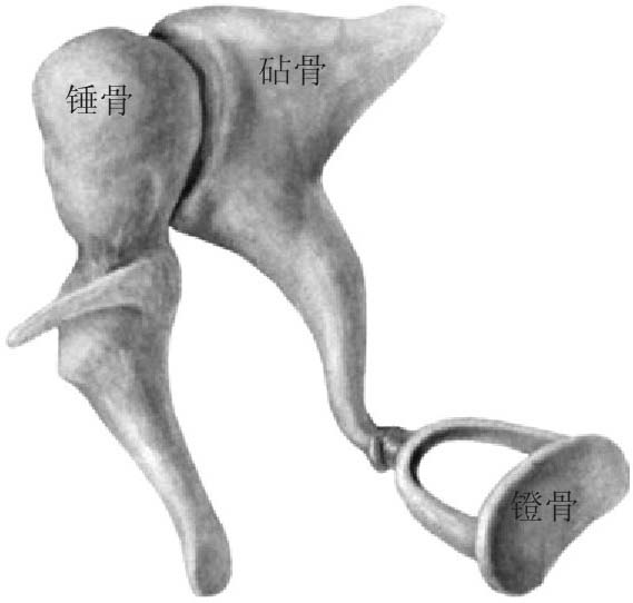 鼓室是位于鼓膜与内耳外侧壁之间的一个小腔,鼓室内有3块相互连接的听小骨(锤骨、砧骨、镫骨,见图2-63)。这些听小骨相互连接,构成听骨链,外接鼓膜,内连内耳。声波引起鼓膜振动后可以经3块听小骨传到内耳。