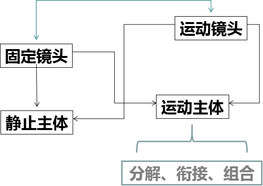 电影中的运动元素,主要包含有“主体的运动”和“摄影机运动”这两个部分,它们既可以单独运动,也可以一起运动。于是电影镜头可以按照动静类型组合为以下这么几种: