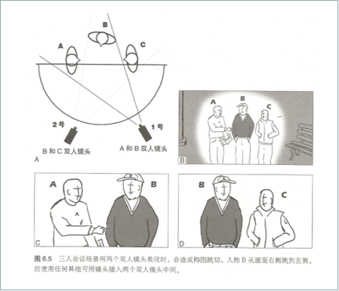 三人对话中,绝不能从双人镜头切至另一个双人镜头。会造成观众的空间感混乱。