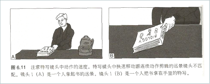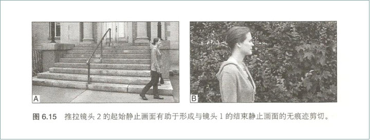 如果横摇、平移或推拉镜头内物体或主体正在移动而接下来又变为静止的话,那么绝不能切换到同一物体或主体的静止镜头。(必须要使运动的物体先在画面中停下来才能剪接到下一个静态镜头)