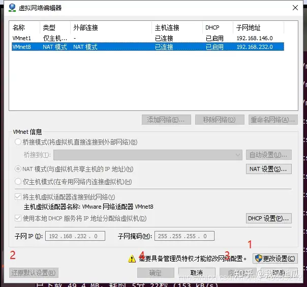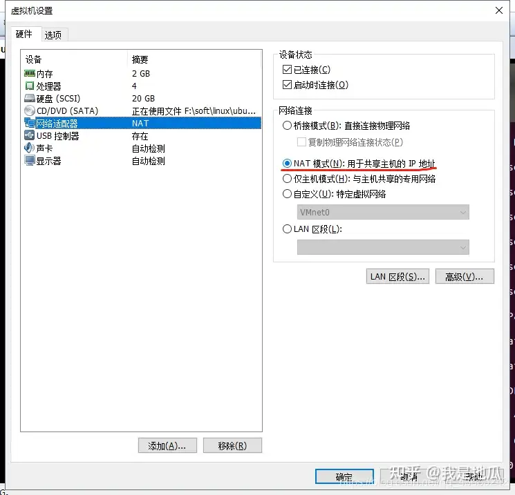 2、选择虚拟机设置查看网络配置是否正确(选择NAT连接);