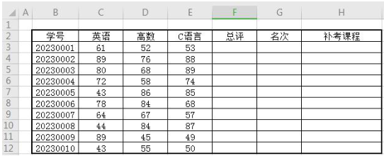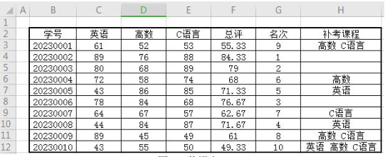 1、新建s6C.et工作薄,对Sheet1工作表按照图2制作表格,要求利用公式计算:总评(即三门课程的平均成绩。四舍五入保留小数点后二位小数)、名次(按总评排名)、补考课程(即不及格课程。多门课程时使用空格分隔)。最终效果如图3所示。