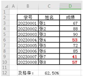 3、“成绩”小于60的,字体红色加粗。其余字体均为黑色,不加粗。