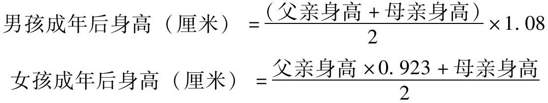 遗传是学前儿童生长发育的生物学基础,儿童的身体特征、发展趋向等都会受父母遗传因素的影响。从父母的遗传因素可以预测子女的身高、体重以及子女的体型、外貌特型等。在相同的生活环境因素下,儿童成年后的身高在很大程度上取决于父母的身高,这种身高的预测可以用下列公式进行测算: