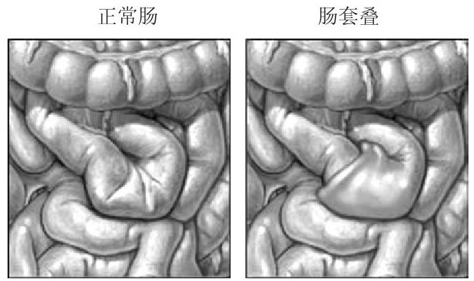 小肠需固定在腹膜上,但学前儿童肠管管壁薄,固定性差,如坐便盆或蹲的时间过久容易出现脱肛现象。腹部受凉或腹泻时,会因肠蠕动加强而诱发肠套叠。肠套叠是指一部分肠管套入相邻的肠管之中,其三大症状是阵发性疼痛、呕吐和果酱样大便,如果得不到及时治疗会危及生命。正常肠、肠套叠的对比如图2-27所示。