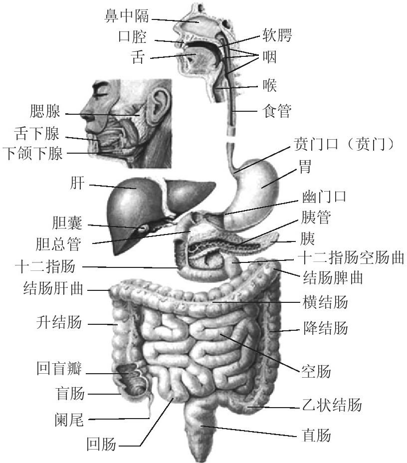 营养物质是机体进行生命活动的前提和基础,人体从外界环境中摄取的营养物质可以作为生长发育、修补机体和更新组织的材料,提供给人体活动所需要的能量。但食物如果不被加工分解成结构简单的小分子物质是无法被机体吸收利用的。消化和吸收的功能由消化系统在消化道完成。消化是指食物在消化道内被分解为可以被吸收的成分的过程。吸收是指经过消化的食物成分及水、无机盐、维生素通过消化道壁进入循环系统的过程。消化系统由消化道和消化腺两部分组成。消化道包括口腔、咽、食管、胃、小肠、大肠和肛门。消化腺主要包括位于消化道外的大消化腺,如唾液腺、肝脏和胰腺等,以及位于消化道内的小腺体,如胃腺、肠腺等。消化腺通过导管与消化管相通,可以使分泌的消化液流入消化管内。消化系统见图2-21。