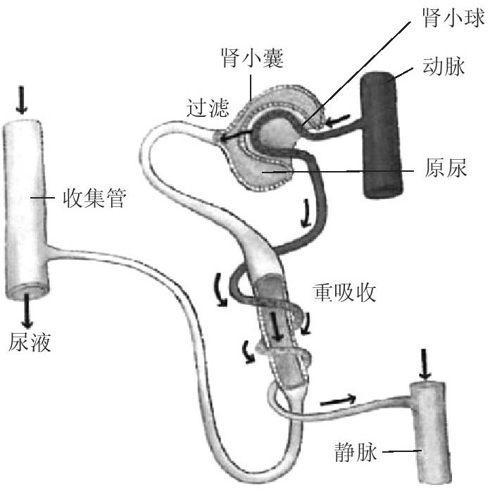 当血液流经肾脏时,因为肾小球的过滤作用,血液中除红细胞、白细胞、血小板和大分子蛋白质外的其他成分,如血浆中的部分水分、无机盐类、葡萄糖、尿素、尿酸等物质会被滤出形成原尿。原尿经肾小管到达肾盂时,对人体有用的物质会被重新吸收入血液,其余代谢产物与水经肾小管流出,进入肾盂形成终尿后短暂储存于膀胱,当尿液充盈后会刺激膀胱壁,产生神经冲动传入排泄中枢,使人产生尿意,人再视情况决定是否排尿。尿液的形成见图2-31。