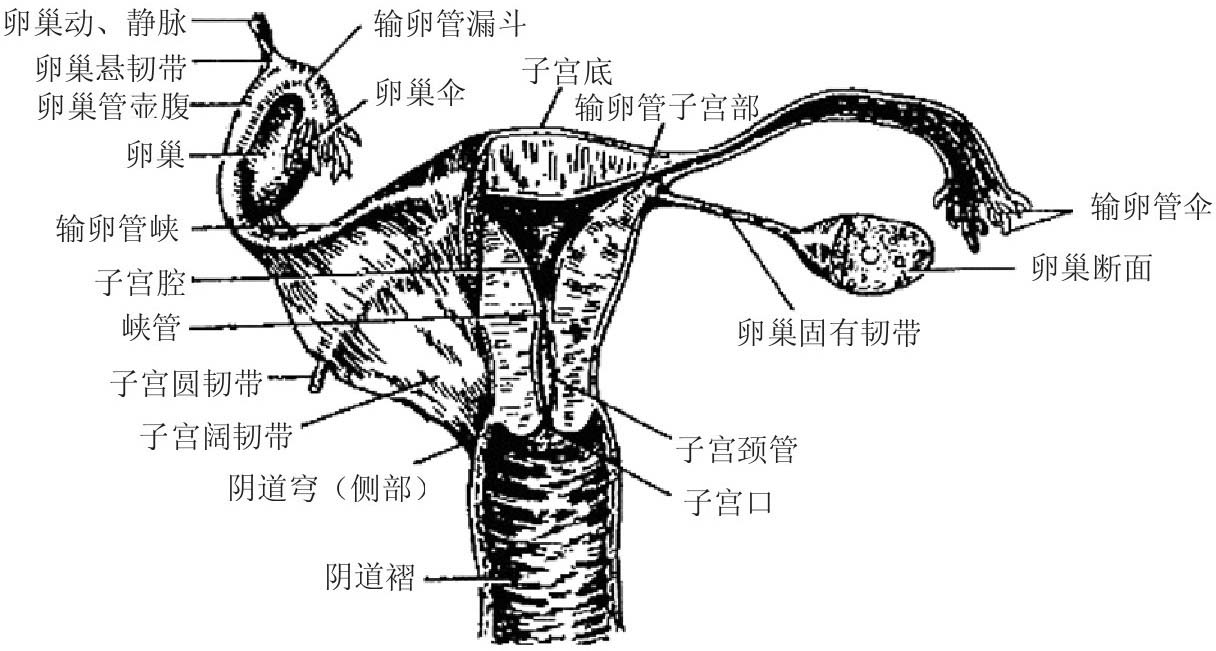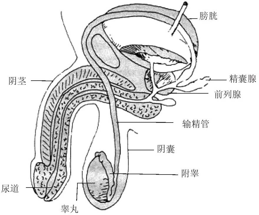 繁殖后代、延续种族是生殖系统的主要功能。此外,产生生殖细胞、分泌性激素以维持性的特征也是生殖系统的功能。生殖器官根据部位可分为内生殖器和外生殖器,根据性别又可分为男性生殖器和女性生殖器。男性内生殖器包括睾丸、附睾、输精管和前列腺等;外生殖器包括阴囊和阴茎,见图2-34。女性内生殖器包括卵巢、输卵管、子宫和阴道,见图2-35;外生殖器主要有大阴唇、小阴唇、阴蒂和前庭大腺。