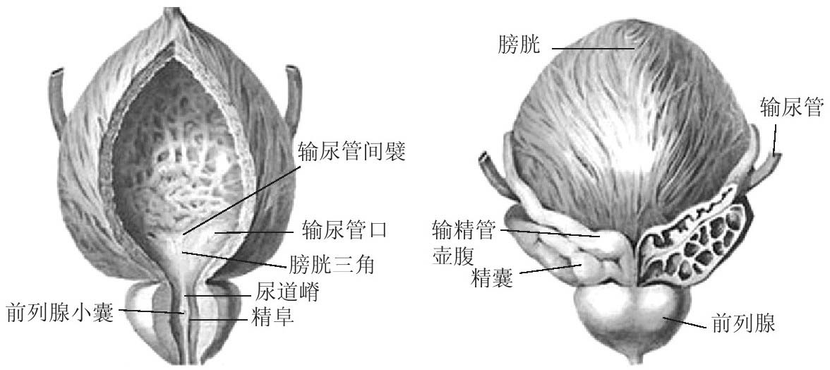 膀胱是储存尿液的肌性囊袋,位于盆腔内,伸缩性很大,其大小、形状、位置及壁的厚薄均随充盈程度、年龄和性别的不同而有所不同。成人膀胱在空虚时呈锥体形,充盈时呈卵圆形,见图2-33。膀胱有通向尿道的开口,在膀胱和尿道交界处有较厚的环形平滑肌,称为尿道括约肌。尿道括约肌收缩时,尿道口关闭;舒张时,尿道口开放,将尿液排出。