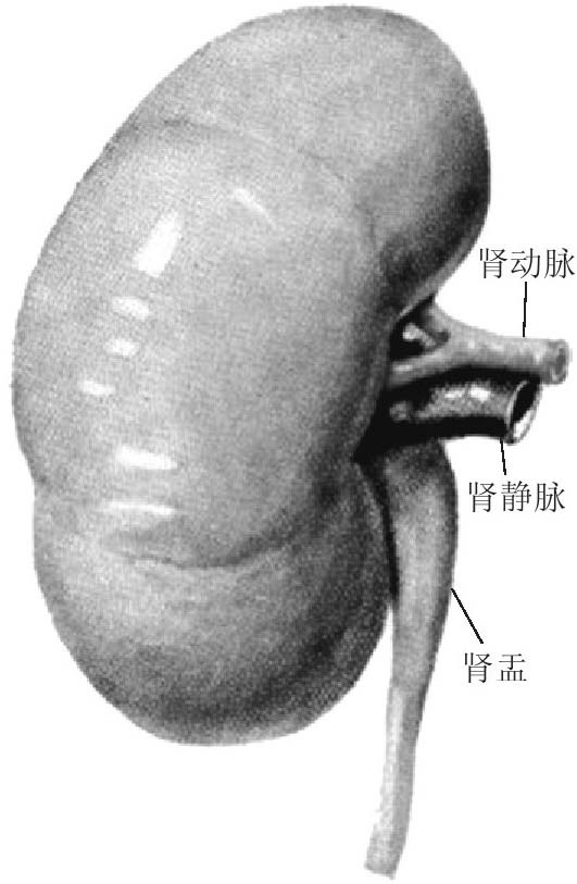 人体肾脏位于腹腔后壁腰部脊柱的两侧,重约300克,形状似蚕豆(见图2-29),左右各一,左肾比右肾高1/2~1个椎体,分为上下两端,前后两面,内外两缘。肾内侧中间凹陷处叫肾门,血管和输尿管、淋巴管及神经等经肾门出入肾脏。
