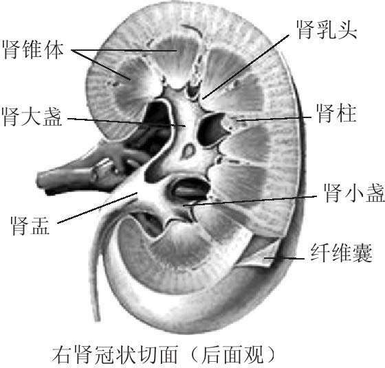 肾脏内部结构见图2-30。肾脏由肾实质和肾盂组成,肾实质又可分为皮质和髓质两部分。肾皮质血管丰富,色暗红,主要由肾小体组成,是肾的泌尿部。肾髓质由集合管和乳头管组成,色较浅,是肾的排泄部。每个肾的实质包括100多万个肾单位。肾单位是肾脏结构与功能的基本单位。肾内有一个漏斗形的空腔为肾盂,它与输尿管相通。