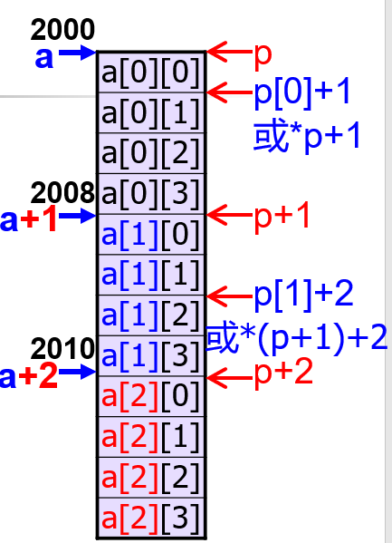 数组名a加1时,地址下移一行;指针变量p加1时,地址指针下移一个元素。