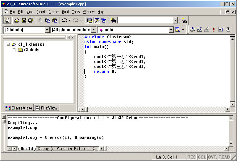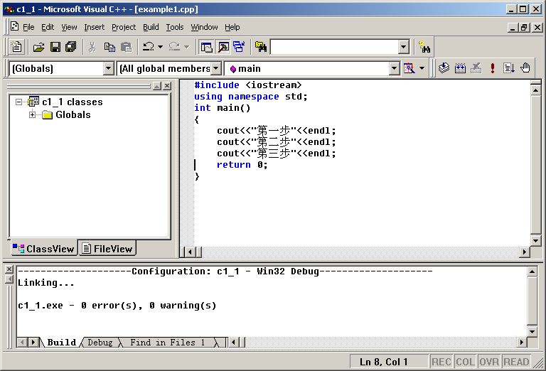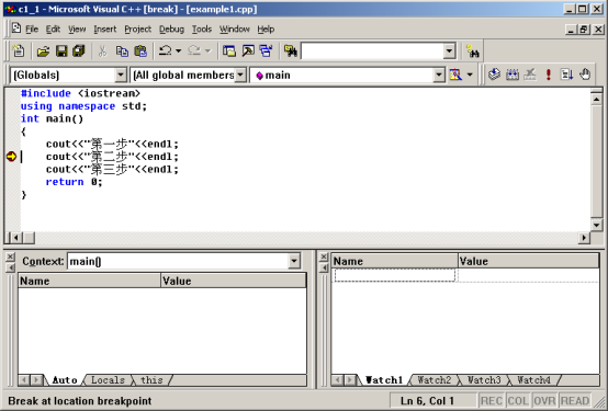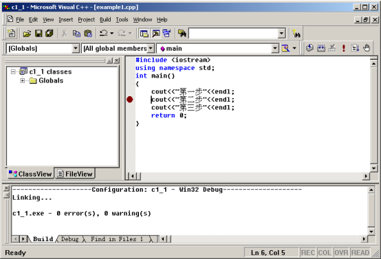 下面通过尝试实现一个简单的DOS程序,熟悉Visual C++ 6.0开发环境,学习如何建立、编译、执行程序。对于复杂的程序,需要了解程序运行过程中代码的执行情况,学习如何设置断点、单步调试,帮助初学者有效的定位程序的错误,更深入的了解程序的运行过程。