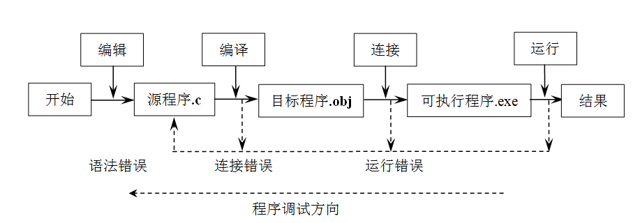 上机输入和编辑源程序→对源程序进行编译,得到目标程序→将目标程序与库函数连接,得到可执行的目标程序→运行可执行的目标程序。以上过程如图1所示。