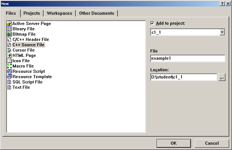 (1)从主菜单中选择File|New,将显示出New对话框,选择Files标签,并从列表中单击C++ source File,在“File”编辑框中输入源程序的文件名example1。