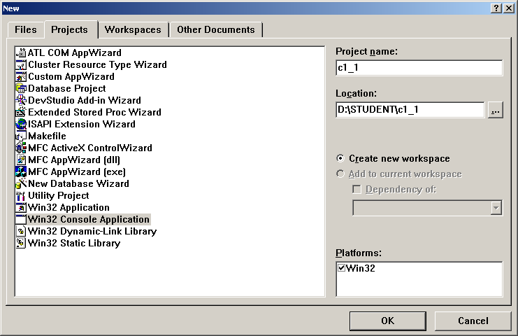 (2)从主菜单中选择File|New,将显示出New对话框;选择Projects标签,并从列表中单击Win32 Console Application,在“Location”编辑框中输入你的工作目录名称,如D:\student,在Project Name编辑框中输入新建工程的名称c1_1;