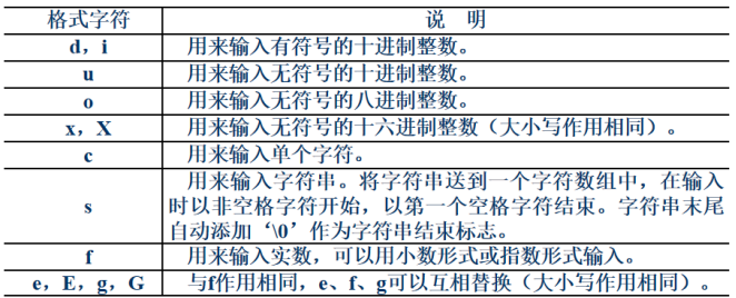 1)格式控制:是由""括起来的字符串,由“格式说明”和“普通字符”两部分组成。用于控制输入数据的类型、个数、间隔符等。