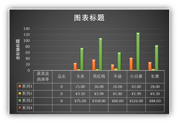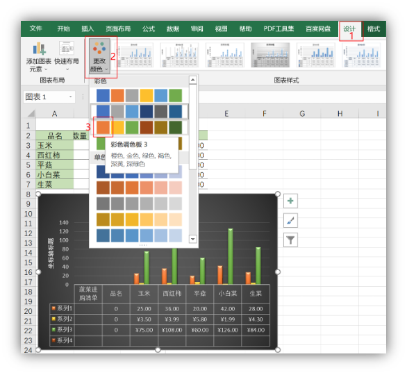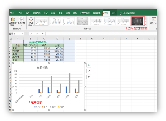 Step 1:打开“蔬菜进购单.xlsx”工作簿。选中整个图表,单击“设计”|“图表样式”|“快速样式”,在其中选择需要的图表样式,如图2-39所示。