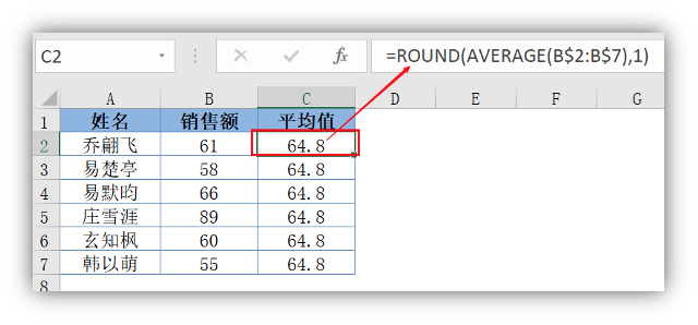 Step 1:在C1单元格输入“平均值”,在C2单元格输入公式=ROUND(AVERAGE(B$2:B$7),1),计算B列销售额的平均值并保留一位小数,向下复制公式到C7单元格,如图2-33所示。