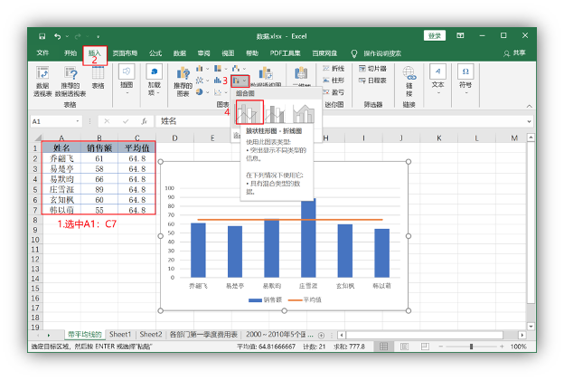 Step 2:选中A1:C7单元格区域,单击“插入”|“插入组合图”|“簇状柱形图”|“折线图”, 如图2-34所示。