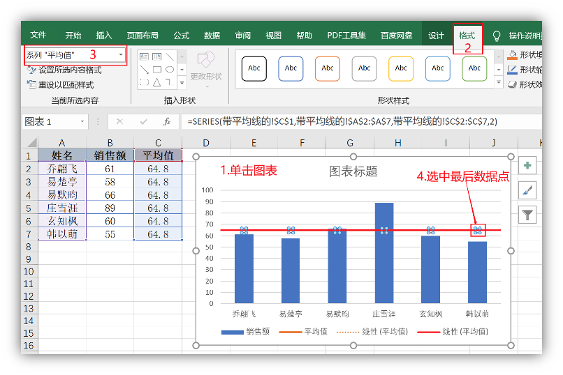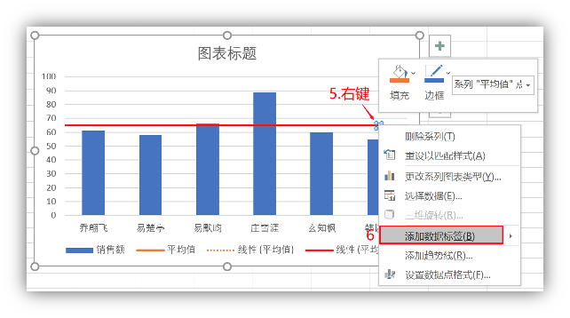 Step 5:单击图表,选择“图表工具”|“格式”左侧的图表元素下拉列表中选中“系列‘平均值’”,再次单击“平均值”数据系列最右侧的数据点,使该数据点处于选中状态,单击鼠标右键,在快捷菜单中选择“添加数据标签”命令,如图2-37、图2-38所示。