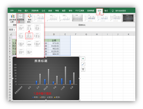 Step 1:打开“蔬菜进购单.xlsx”工作簿。选中整个图表,单击“设计”|“图表布局”|“快速布局”,在弹出的下拉列表中选择想要的布局样式,如图2-41所示。