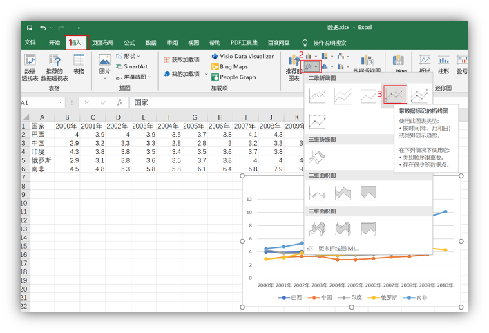 Step 2:选择图表类型。单击“插入”|“图表”|“折线图”。