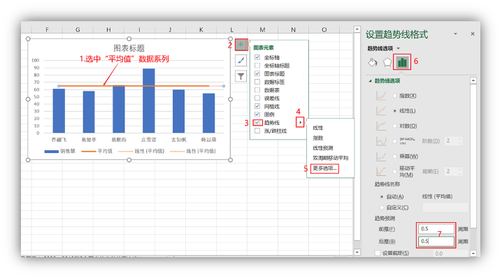 Step 3:单击选中“平均值”数据系列,再单击“图表元素”|“趋势线”右侧的展开按钮,单击“更多选项”|“设置趋势线格式”。设置趋势预测前推0.5周期,后推0.5周期,如图2-35所示。