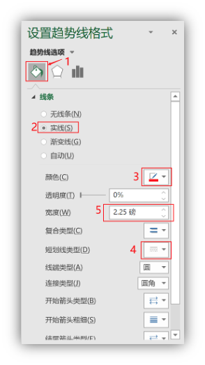 Step 4:切换到“填充与线条”|“实线”,设置颜色为红色,短划线类型为实线,宽度为2.25磅,如图2-36所示。