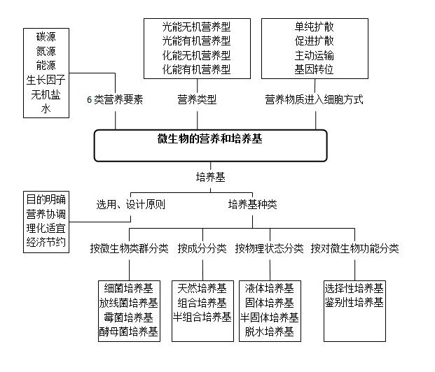 在微生物的营养中有六大要素物质:碳源、氮源、能源、生长因子、无机盐和水,大部分以无机或有机物的形式为微生物所利用,也有一些以分子态气体方式供给。