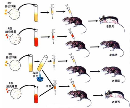 1928年英国医生F.Griffith首次发现转化现象。少量的R型与大量加热杀死的S型细胞混合注射到小白 鼠体中,白鼠病死,在其尸体内发现有活的S型细胞。此实验说明,加热杀死的S型细菌,在其细胞内可能存在一种转化物质,它能通过某种方式进入R型细胞,并使R型细胞获得稳定的遗传性状。