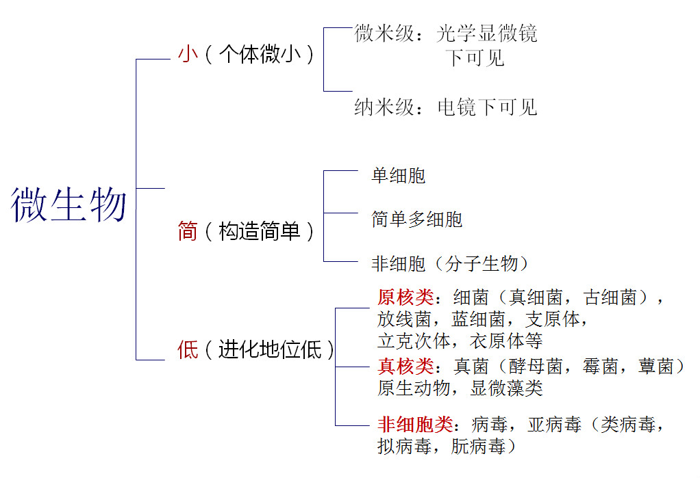 微生物的特点:小(个体微小)、简(构造简单)、低(进化地位低)。