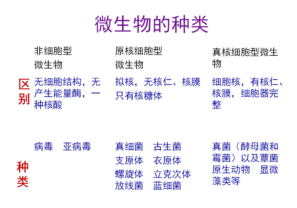 微生物类群:原核类细菌(真细菌和古生菌)、放线菌、蓝细菌、支原体、衣原体、立克次氏体;真核类真菌(酵母菌、霉菌、蕈菌)、原生动物和显微藻类;非细胞类的病毒和亚病毒(类病毒、拟病毒、卫星病毒、卫星RNA和朊病毒)。