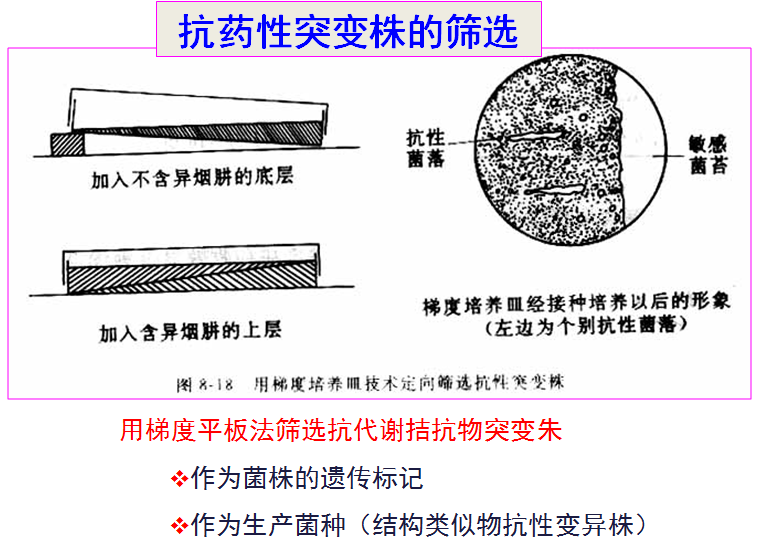 ◆ 一般通过营养缺陷型突变株、抗阻遏和抗反馈突变型、抗性突变型(抗生素抗性突变株、条件抗性突变株)来筛选。